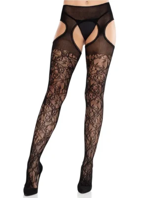 Cross Hatch Floral Lace Suspender Hose Black