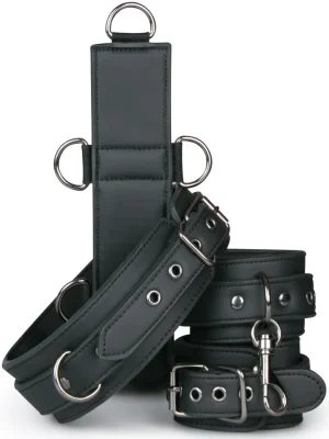 Parādi savam partnerim, kurš ir noteicējs, ar šo satraucošo bondage komplektu! Komplektā ietilpst siksna ar lencēm, roku dzelži un kakla apkakle. Gan roku dzelžus, gan apkakli var viegli pielāgot, lai tie ideāli piegulētu. Materiāls ir stingra mākslīgā āda ar mīkstu putu polsterējumu, kas novērš noberzumus un padara lietošanu īpaši komfortablu. Siksnām ir piestiprinātas deviņas mazas D-gredzenu cilpas un viena liela D-gredzena cilpa. Roku dzelži un apkakle ir aprīkoti ar klipšu stiprinājumiem, lai tos varētu ātri piestiprināt vai noņemt no siksnas. Pateicoties siksnu garumam un daudzajiem D-gredzeniem, vari pilnībā kontrolēt savas bondage rotaļas un pielāgot šo komplektu tieši savai gaumei.