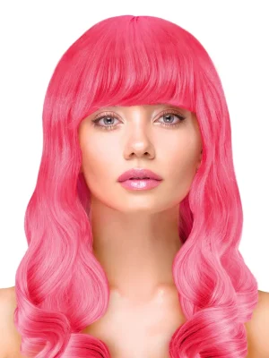 Gara neona rozā parūka ar viļņainiem matiem un čolku.