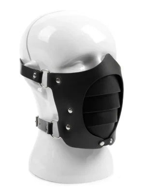 Ideāls papildinājums jebkurai BDSM kolekcijai – panku stilā iedvesmota maska ar spēcīgām detaļām. To var ērti pielāgot, pateicoties sprādzēm uz divām aizmugurējām siksnām, lai maska cieši piekļautos un būtu ērti nēsājama.